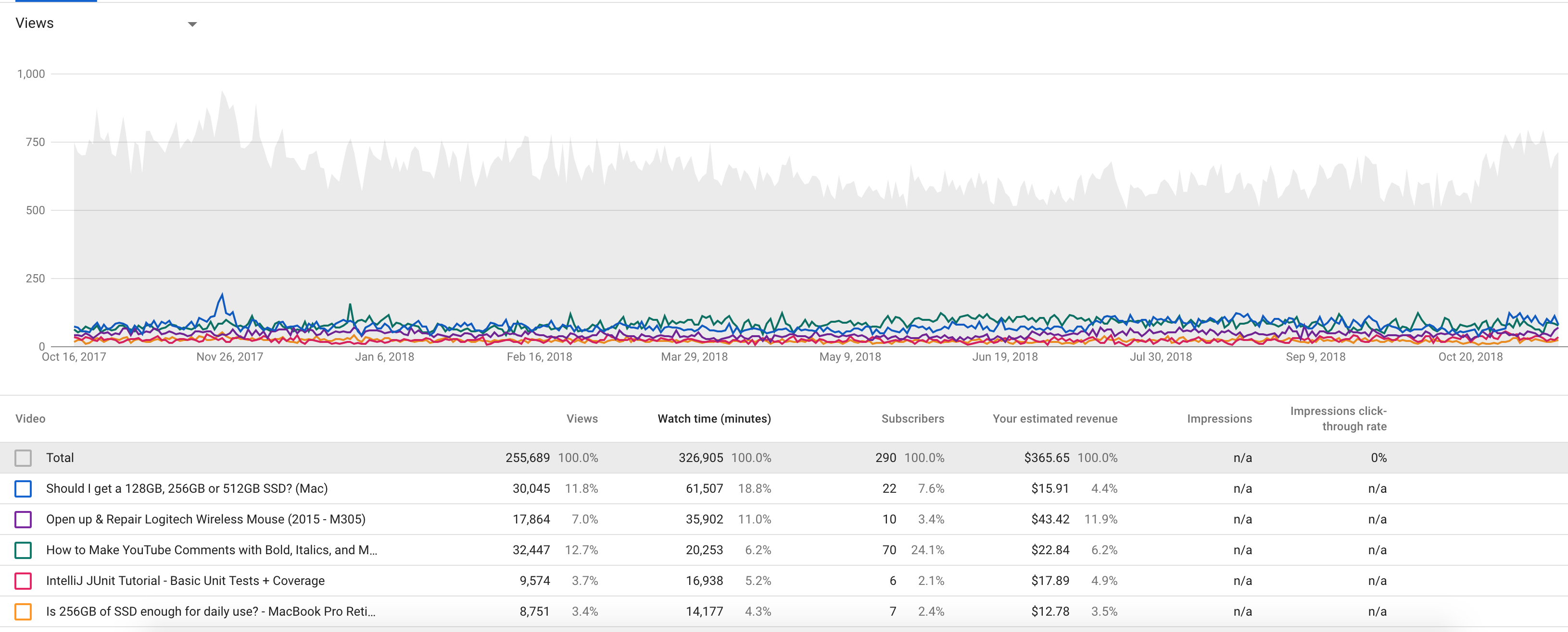 Unfortunately, my most popular videos aren’t representative at all of my channel as a whole - but this goes to show how luck with tags and spotting a niche can help bring in more viewers.